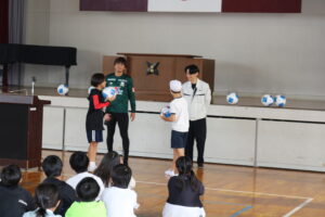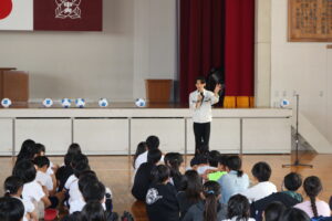 まず、長谷社長からのご挨拶、柏木アンバサダーからの自己紹介の後、サッカーボールの贈呈式を行いました。ボールを受け取った代表の方だけでなく、他の生徒の方も、きらきらした笑顔がとても印象的でした。
