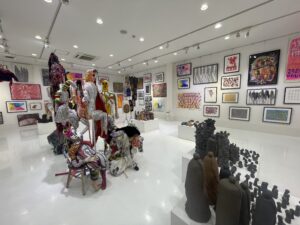 90名近くのアーティストが、粘土・絵画・刺繍などの創作活動を行うアトリエをご紹介いただきました。当日お休みされている利用者の方だけでなく、現在は利用することができなくなった利用者さんまで、すべての方の作品と創作方法やエピソードを教えていただきました。