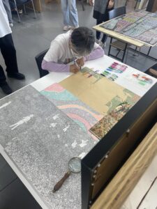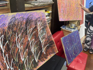 実際の制作風景を見るのは初めてで、みなさんの集中力と生まれる作品に圧倒されつつ、利用者さんそれぞれに最適な場所を提供していること、そして利用者さんの得意を活かした創作活動をスタッフのみなさんで探していることがすごく伝わってくる時間でした。